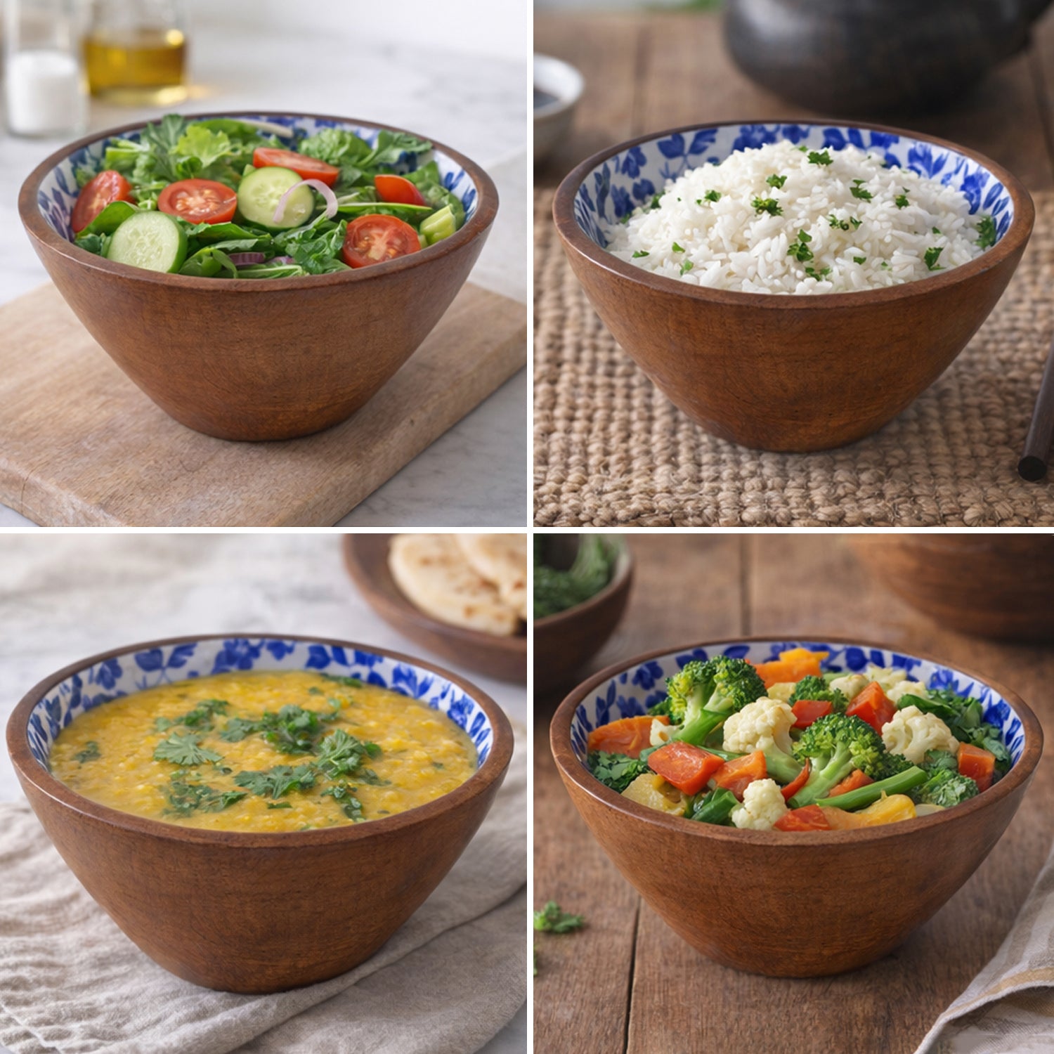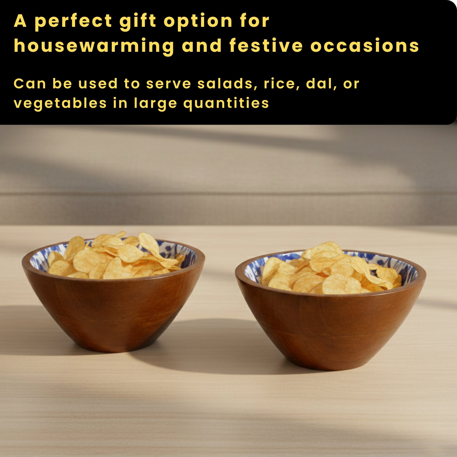 'Indigo Baagh' Wooden Serving Bowls (Set of 2, 720 ml Each, Hand-Enameled)