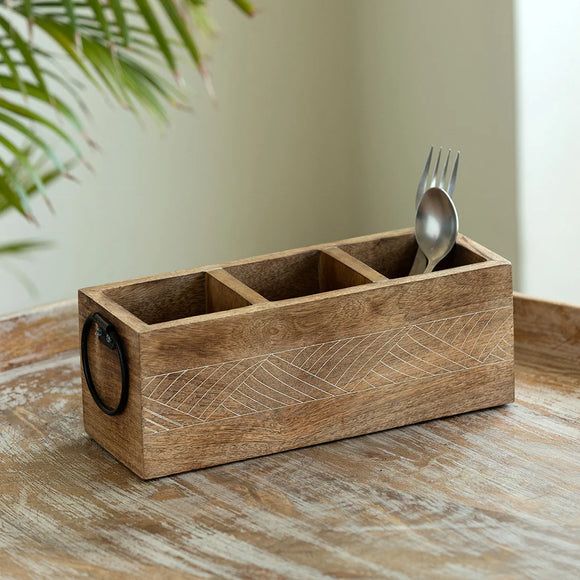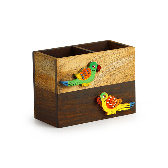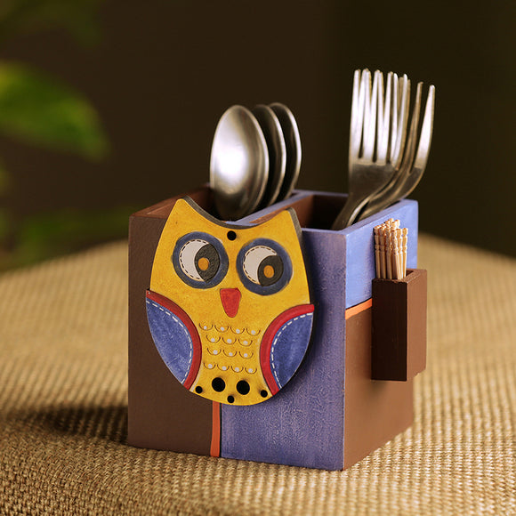 'Owl Motif' Cutlery & Toothpick Holder In Wood (3 Partitions)