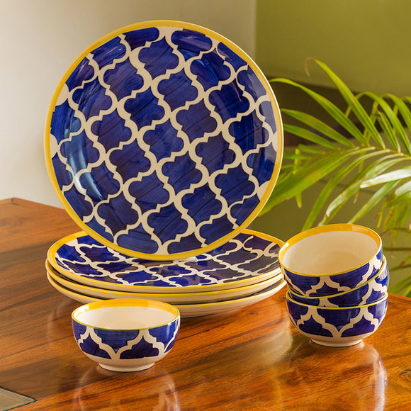 'Moroccan Dining' Handpainted Ceramic Dinner Plates With Katoris & Serving Bowls (10 Pieces, Serving for 4): This small dinnerware set includes four dinner plates, two serving bowls that hold 520 ML each, and four katoris that hold 180 ML each. It was hand-made and hand-glazed in ceramic in Uttar Pradesh, and the hand painting was influenced by an idyllic time when the nation's beaches had yellow-white soil that touched the azure bodies of water of the Atlantic and the Mediterranean Seas. ideal for feeding 4 persons with regular meals this is one of the best dinner sets.