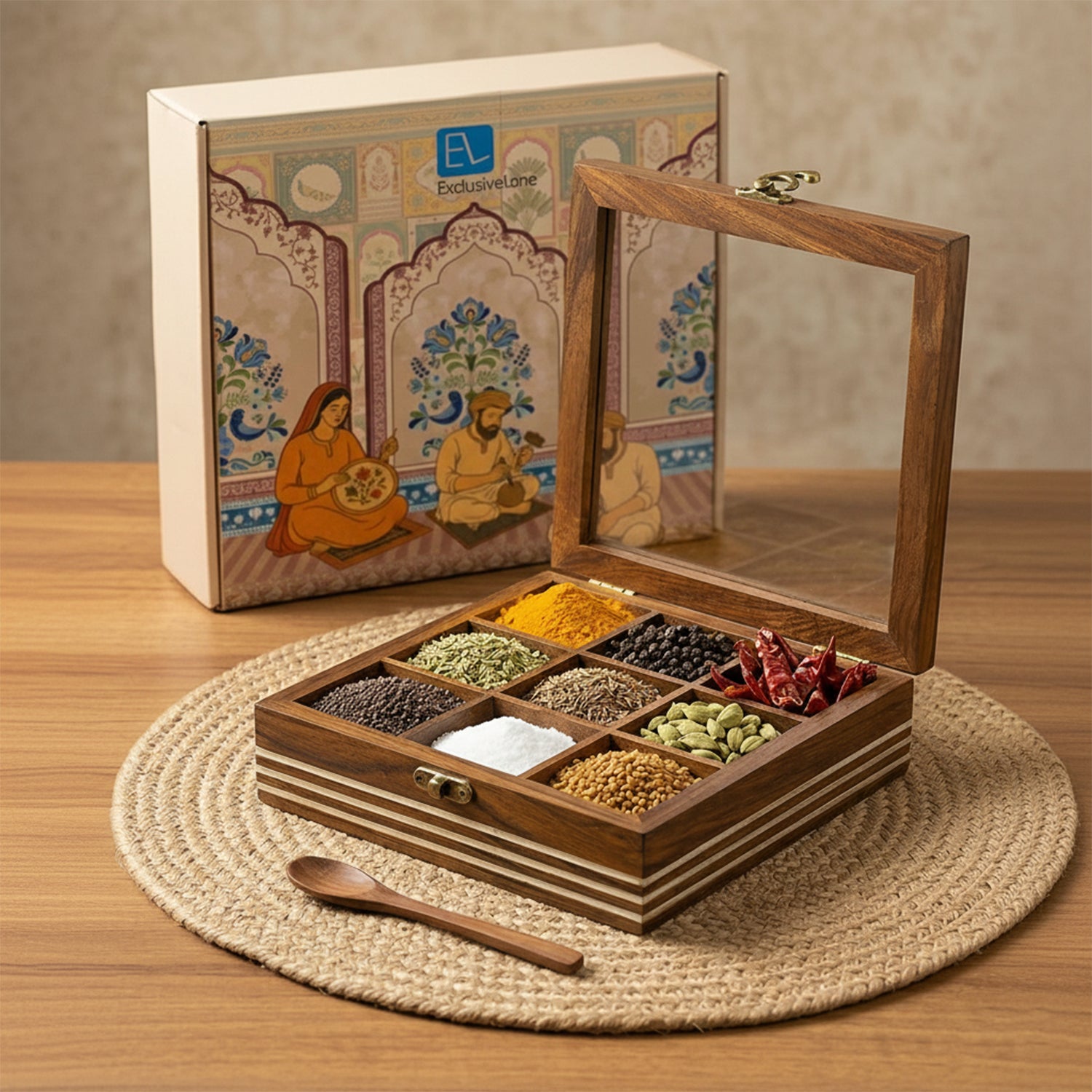 This household utility cum decor spice box comprising of nine non-detachable compartments that comes as a set of a box with a non-detachable glass lid with a metallic lock and a spoon. Handgraved in Sheesham wood with love and warmth, the square shape box comes bathed in the earthly shade of brown. Subtly handpainted on the engraved edges, this box can also be used as a multi-utility container or as a knick-knack or jewellery box. It is an ideal addition to your household, to hold the flavours of your home in a polish of elegance.
