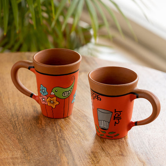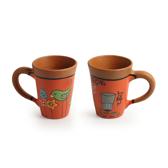 'Chai Birdies' Terracotta Coffee & Tea Cups (Set Of 2, 250 ML, Hand-Painted, Orange)