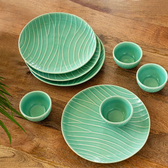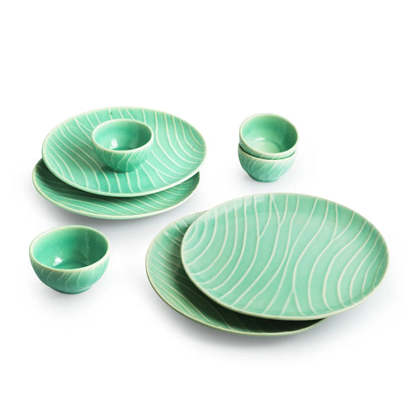 'Caribbean Green' Hand Glazed Ceramic Dinner Plates With Dinner Katoris (8 Pieces, Serving for 4, Microwave Safe, Hand-Etched)