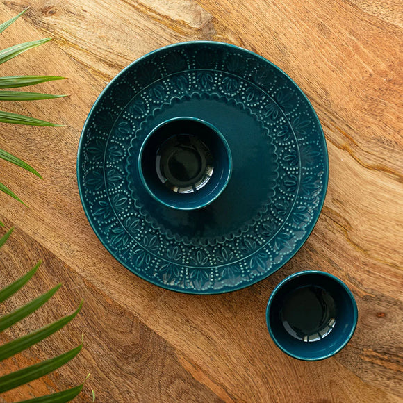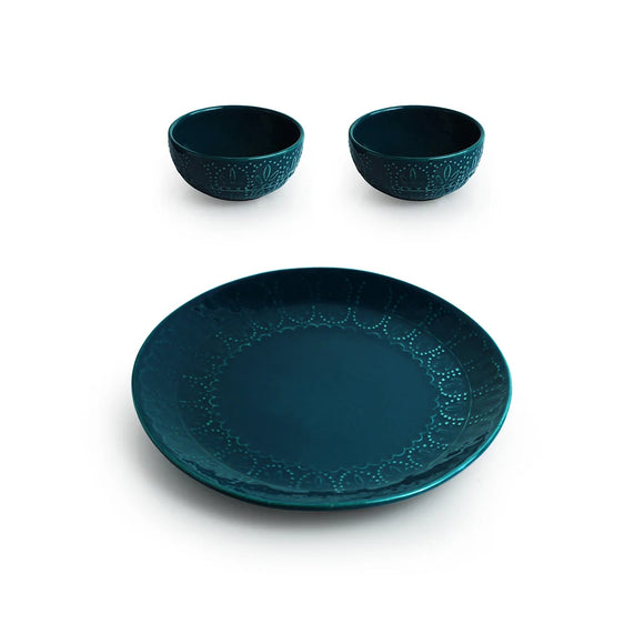 'Teal Forest' Hand Glazed Ceramic Dinner Plate With Dinner Katoris (3 Pieces, Serving for 1, Hand-Etched, Microwave Safe)
