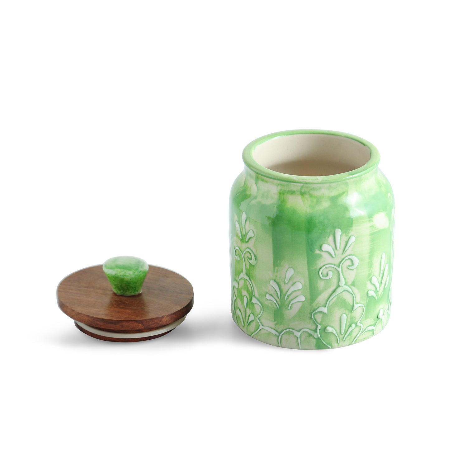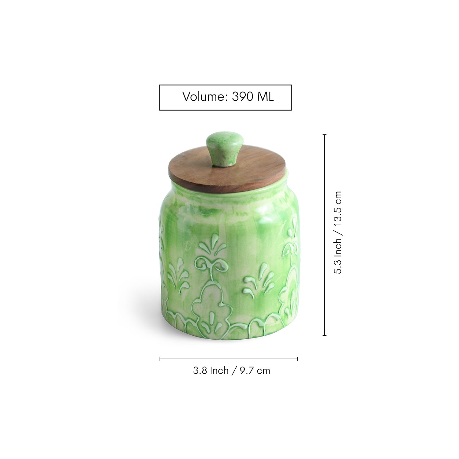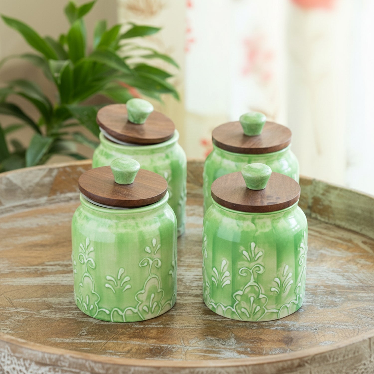 'Green Keepers' Multi-Utility Storage Jars & Containers In Ceramic With Wooden Lid (Set of 4, Airtight, 390 ML, Hand-Embossed, 13.5 Cm)