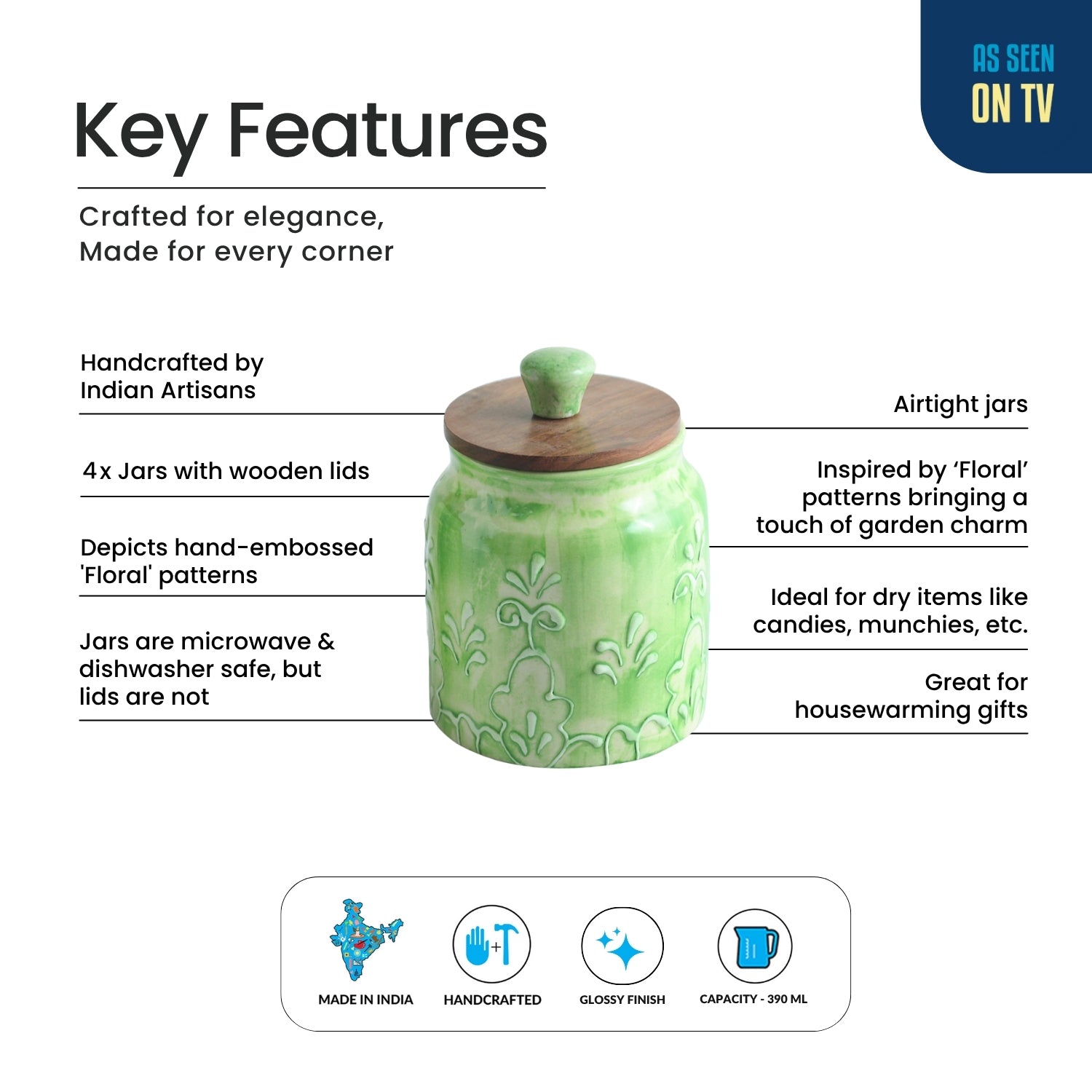 - Ideal to be used as multi-purpose jar or container for storing candies, toffees, munchies or dry condiments like cardamom, clove, etc.