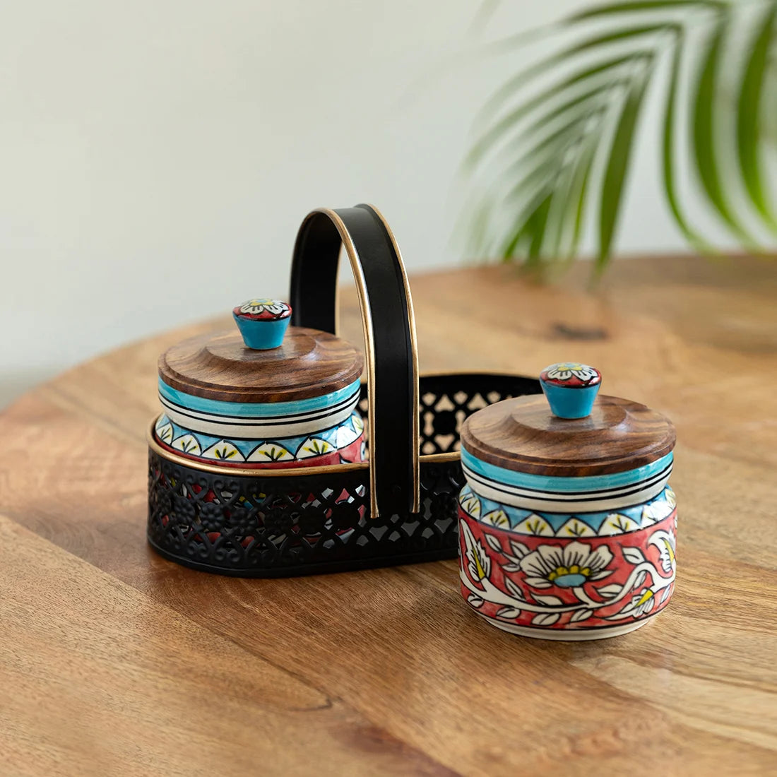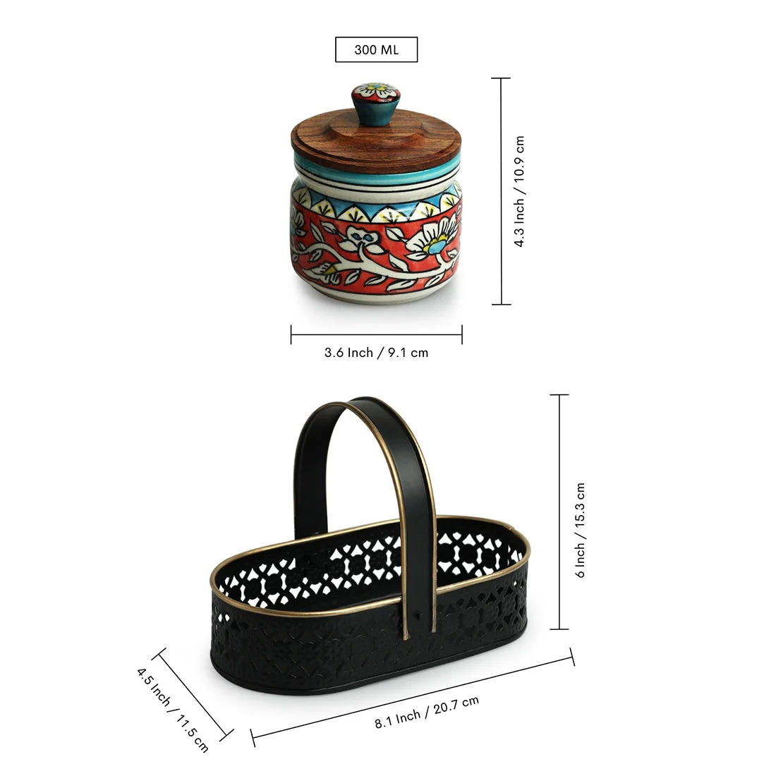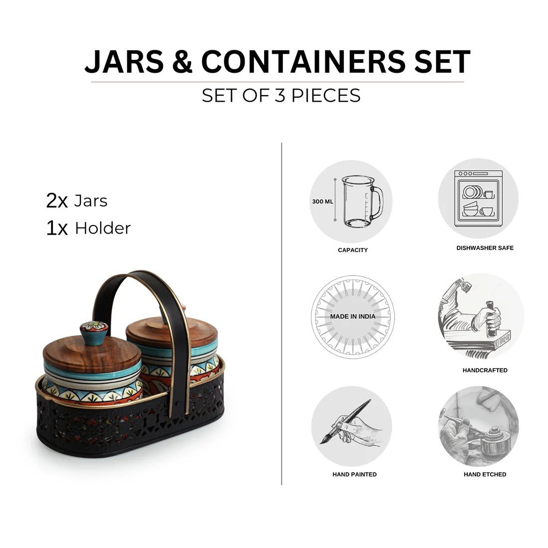 The 'Mughal Round' is a set of 2 multi-purpose jars with 1 holder. The jars are hand-painted with mughal floral motifs and have a volume of 300 ml. The jars are made in ceramic with sheesham wood lids and the holder is handcrafted in powder coated iron. Hand-Etched & Hand-painted with so much elegance by our artisans, this exclusive set of tableware can also be used as an ideal gifting option for house-warming parties and festive seasons. This is a perfect home-item to be used as a multi-purpose jars or containers for storing dry condiments like dry fruits, tea, sugar or various other knick-knacks and embellishing your wholesome experience in your warm and cosy abodes.