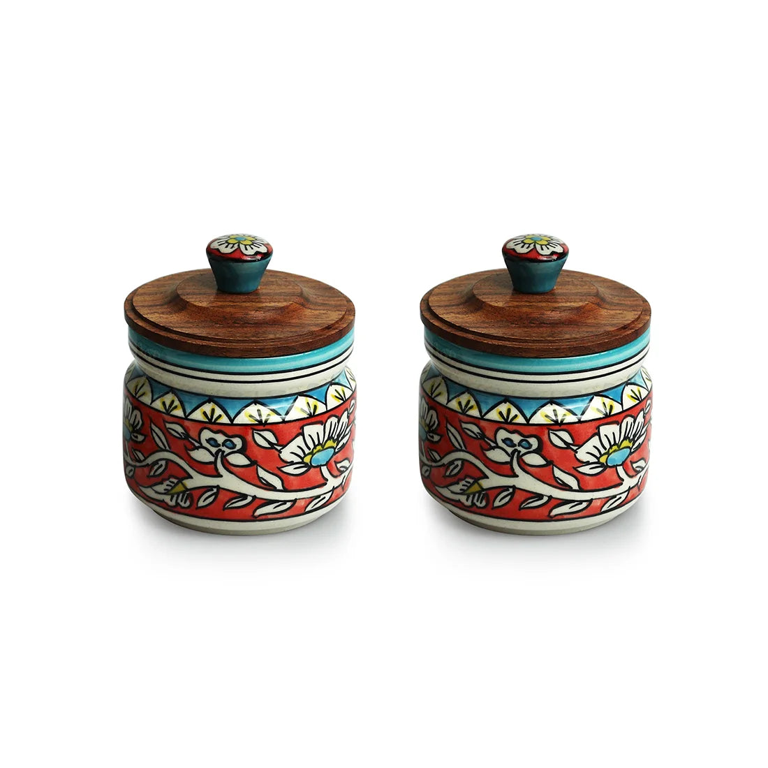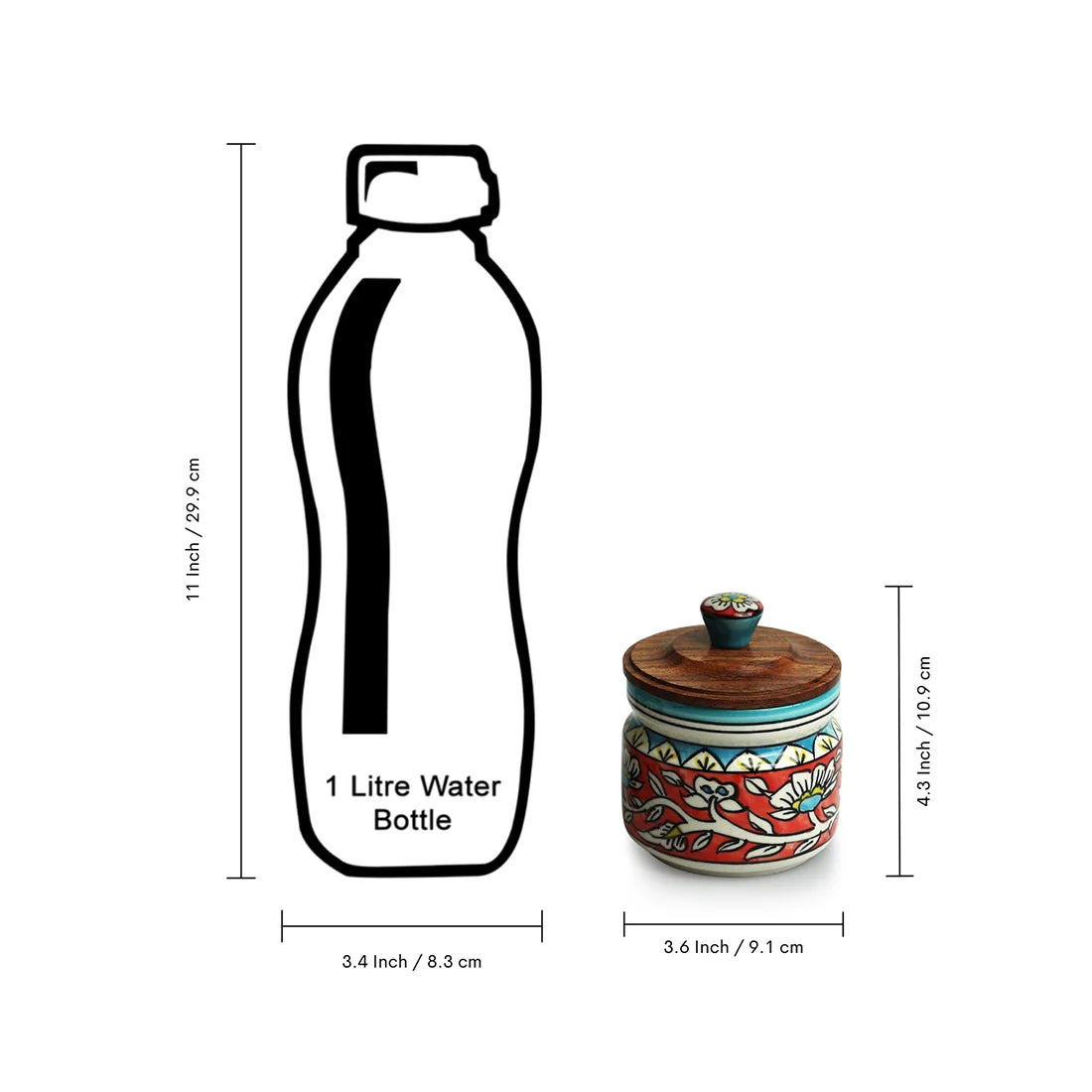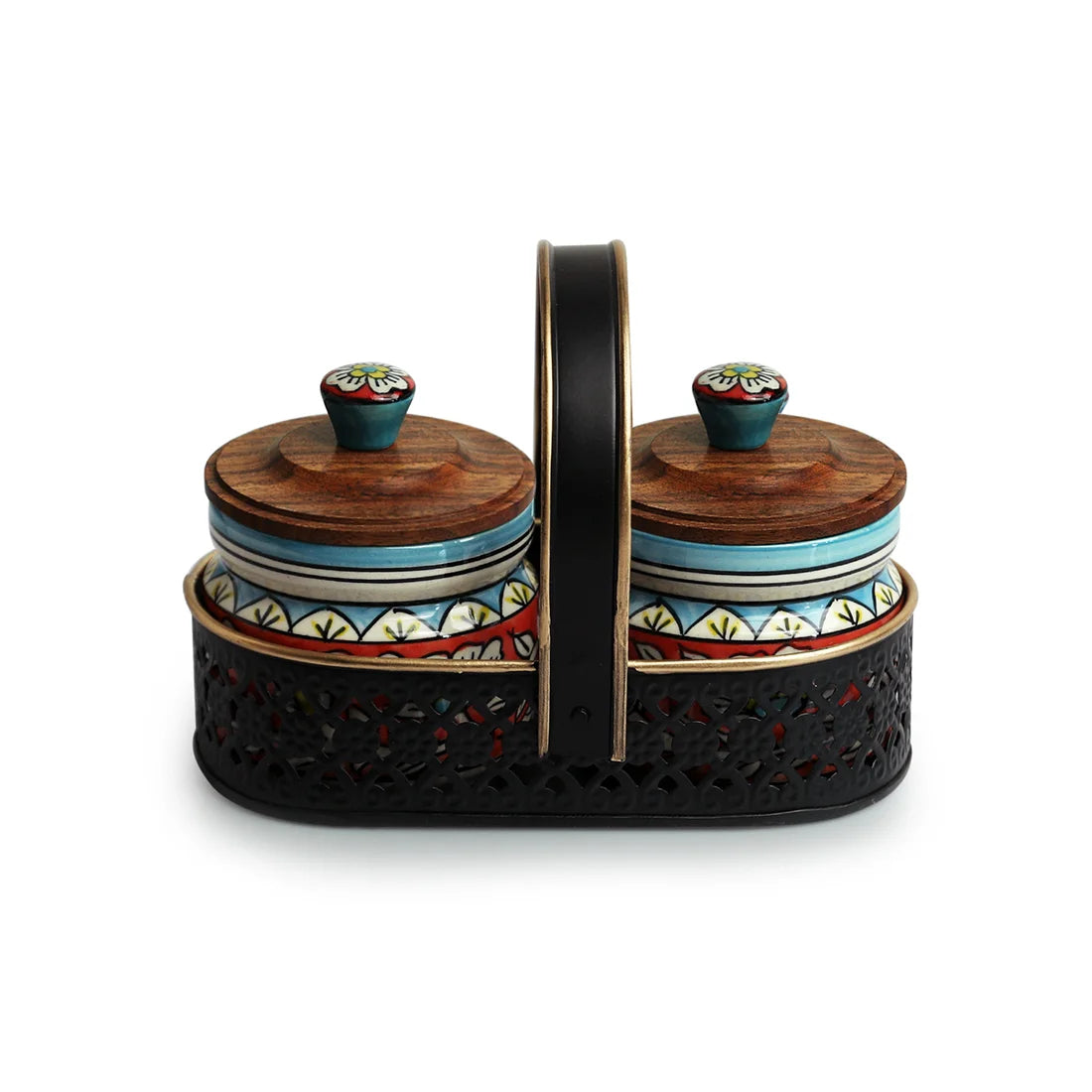 The 'Mughal Round' is a set of 2 multi-purpose jars with 1 holder. The jars are hand-painted with mughal floral motifs and have a volume of 300 ml. The jars are made in ceramic with sheesham wood lids and the holder is handcrafted in powder coated iron. Hand-Etched & Hand-painted with so much elegance by our artisans, this exclusive set of tableware can also be used as an ideal gifting option for house-warming parties and festive seasons. This is a perfect home-item to be used as a multi-purpose jars or containers for storing dry condiments like dry fruits, tea, sugar or various other knick-knacks and embellishing your wholesome experience in your warm and cosy abodes.