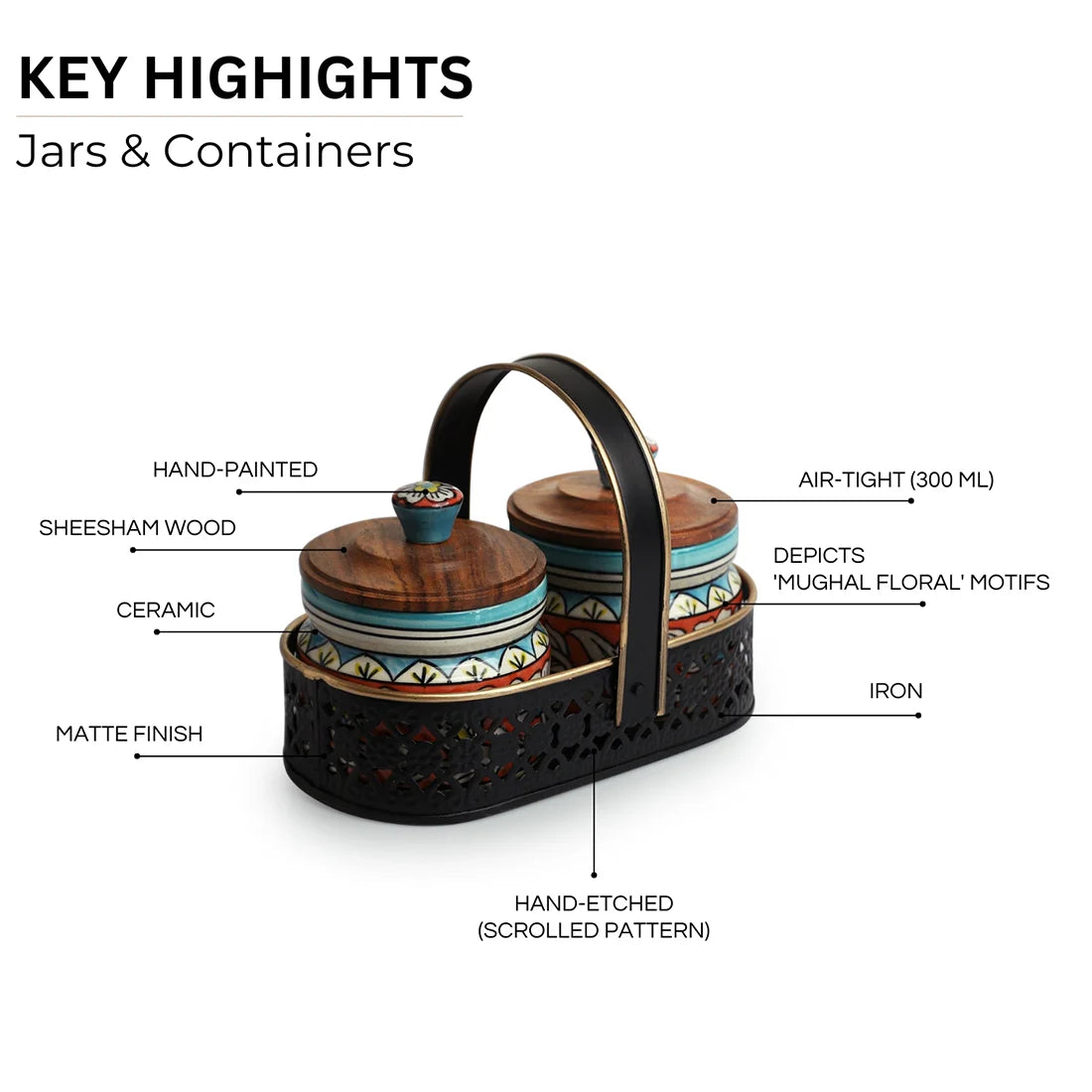 - Depicts beautiful mughal floral motifs hand-painted on jars with wooden lid. The jars are placed in an iron holder.