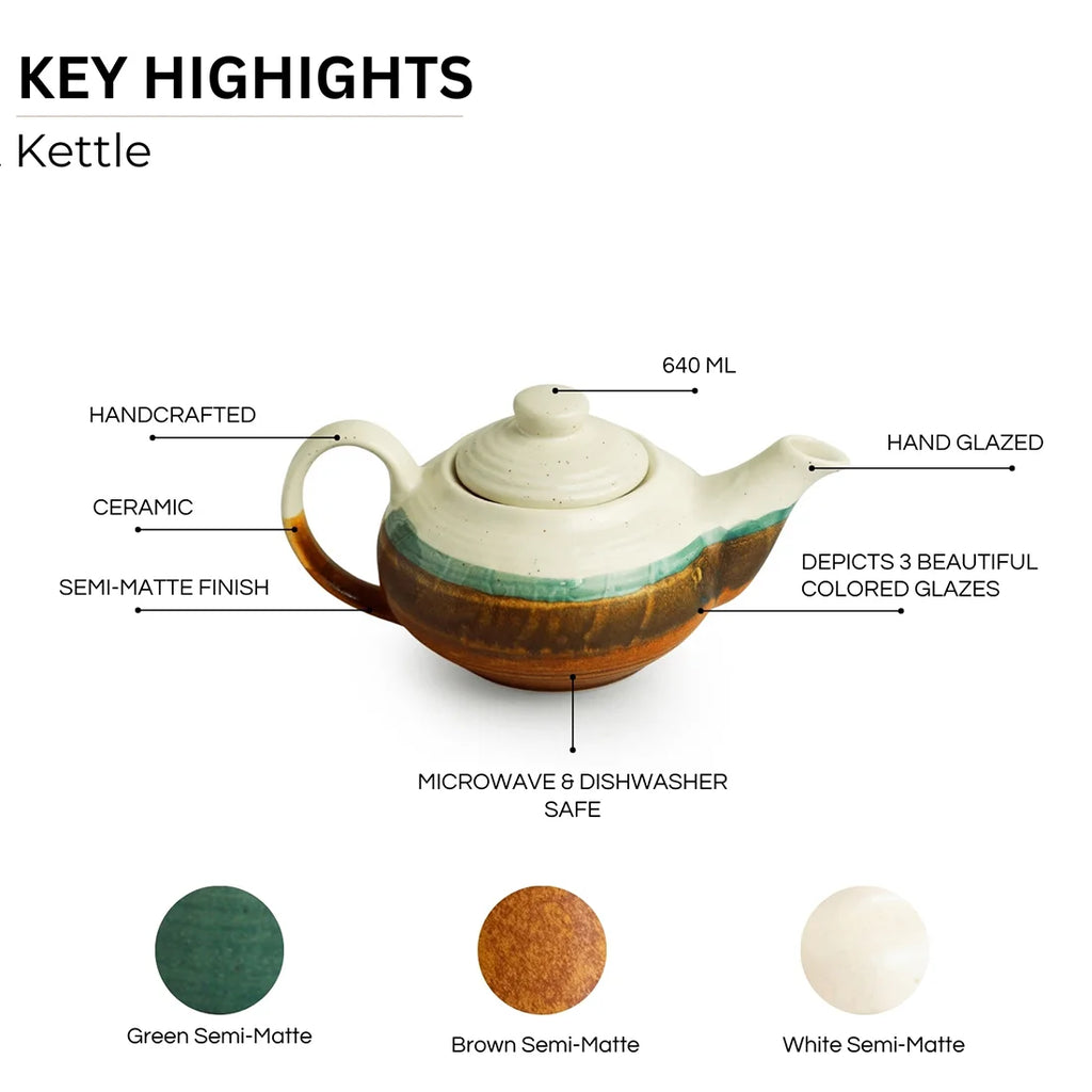 - Depicts beautiful fusion of 3 colours (White, Green & Brown) through hand glazing on tea cups & a kettle.