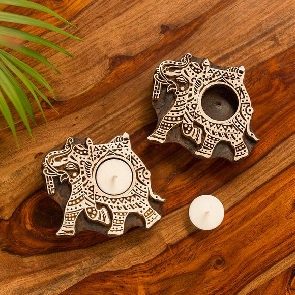 'Dazzling Elephant' Hand-Carved Block Tea-Light Holder In Sheesham Wood