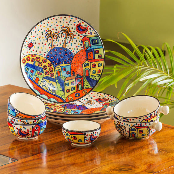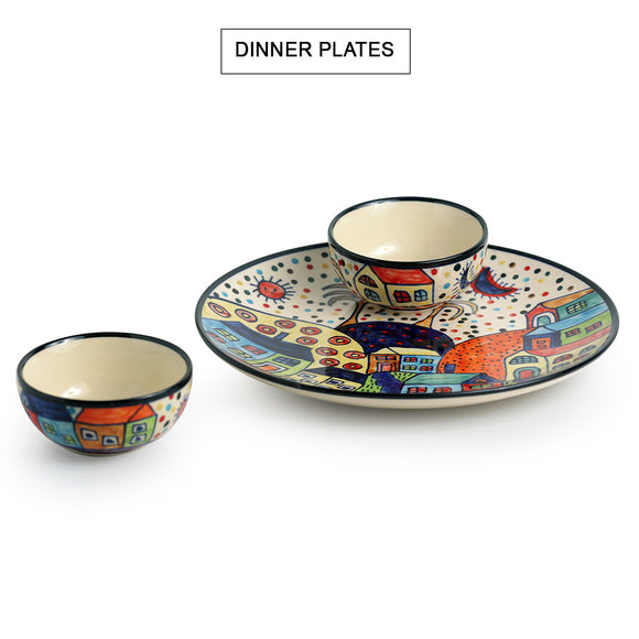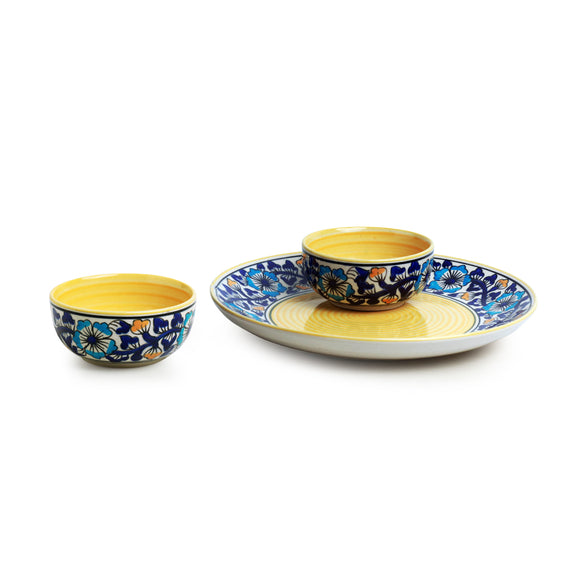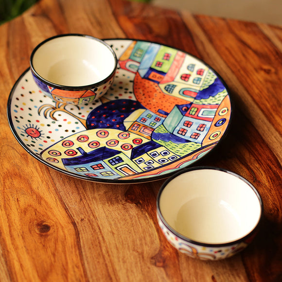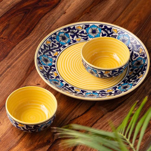 'Badamwari Bagheecha' Hand-Painted Ceramic Dinner Plate With Katoris (3 Pieces, Serving for 1, Microwave Safe)