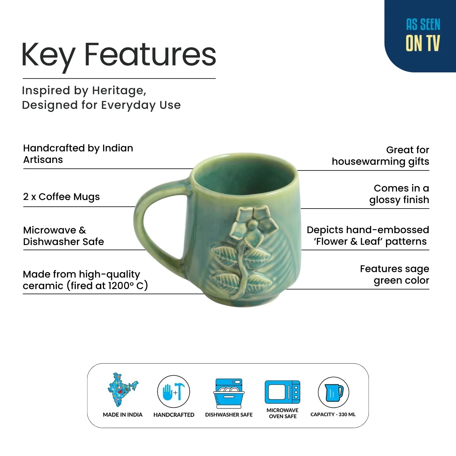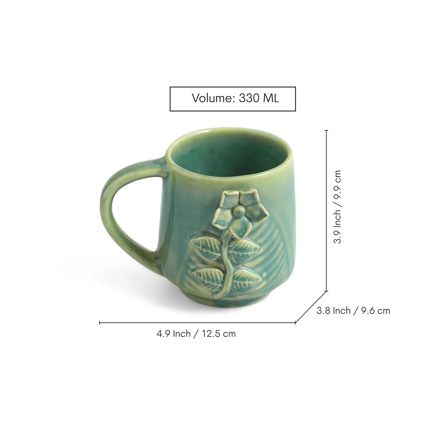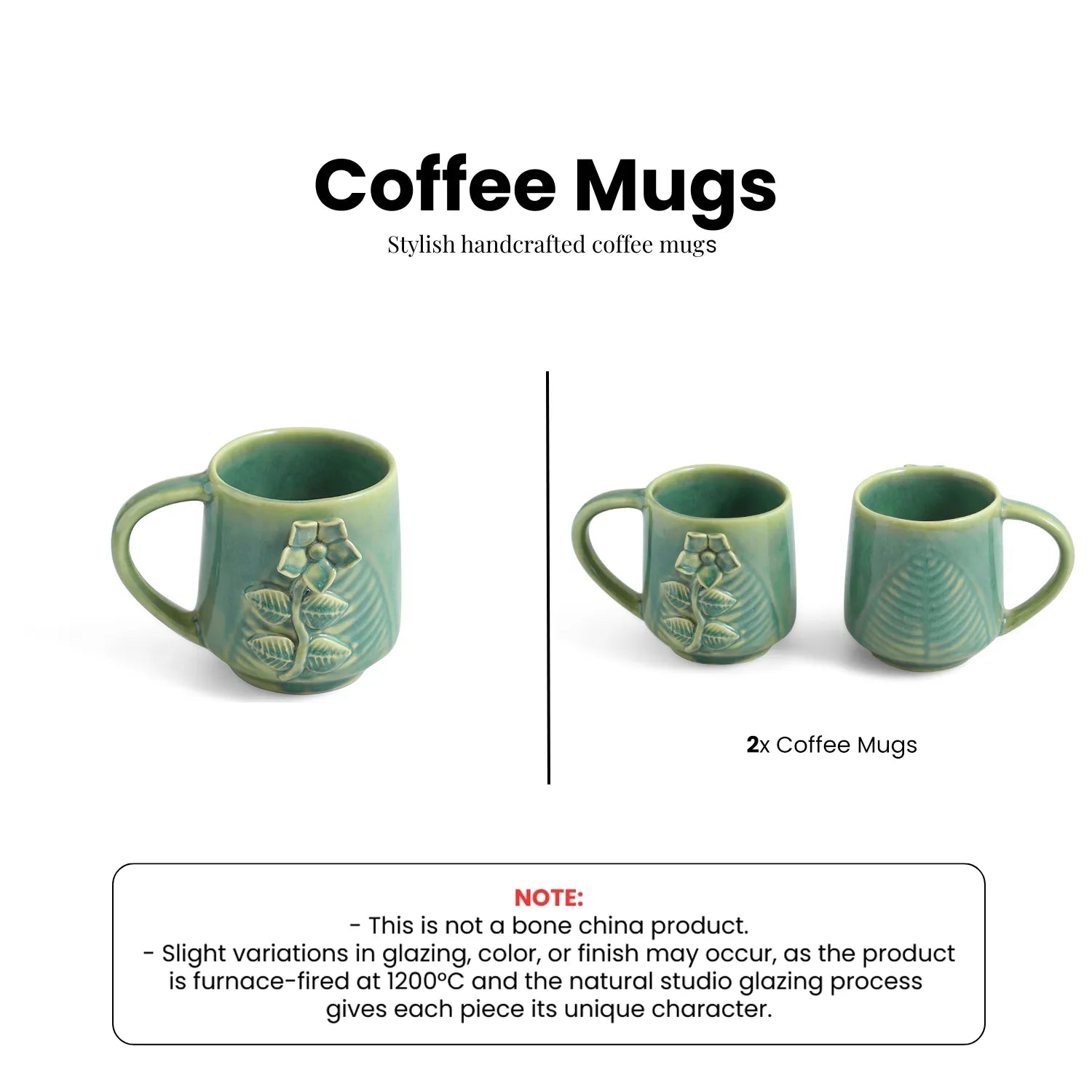 ExclusiveLane 'Sage Serenity' Ceramic Tea And Coffee Mugs (Set of 2, 330 ML, Microwave Safe, Hand-Embossed)