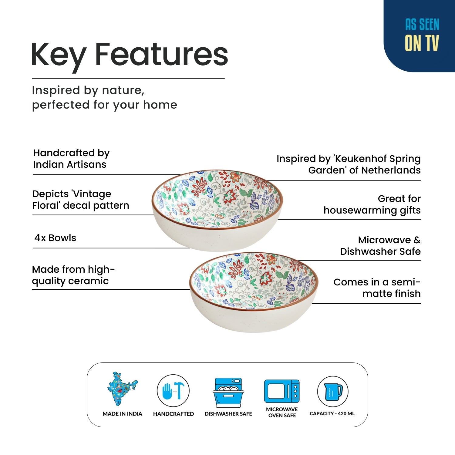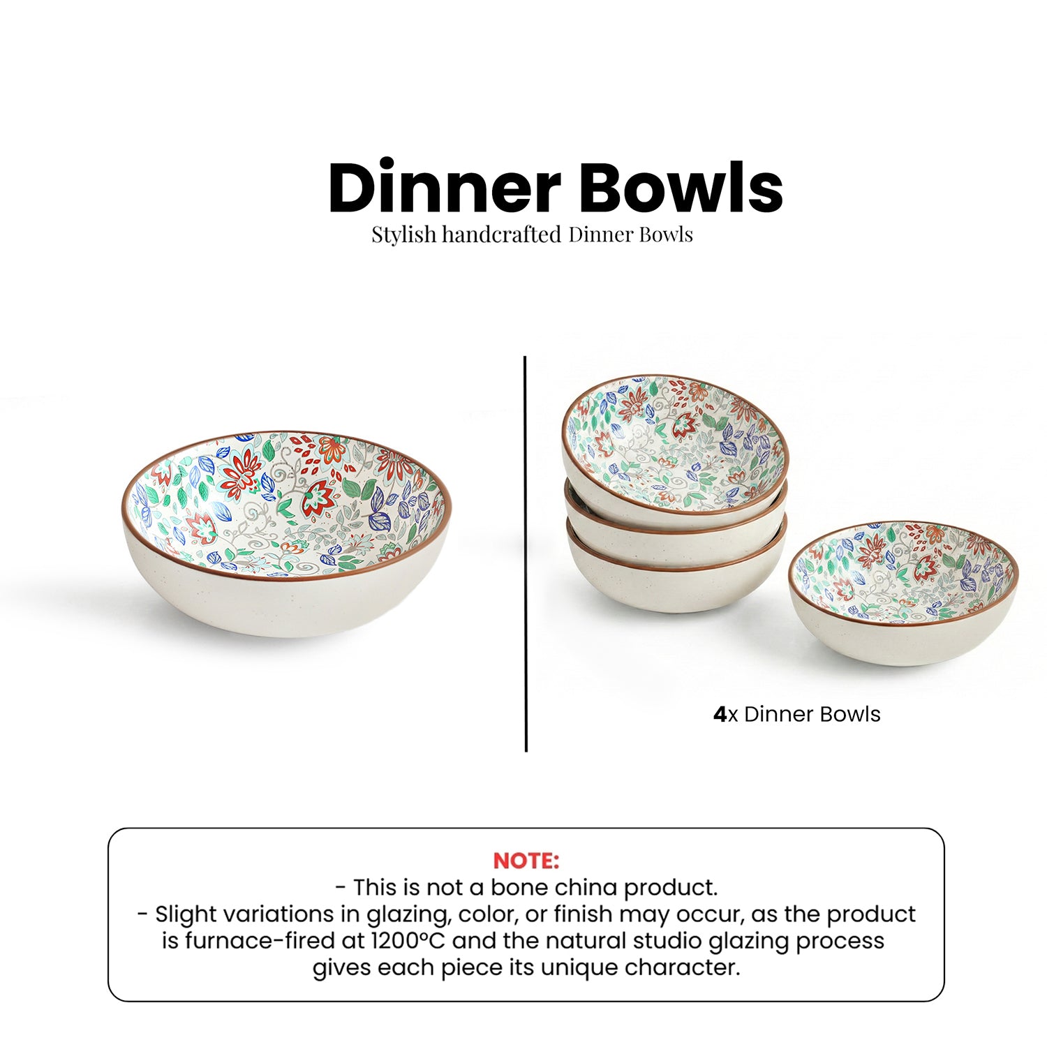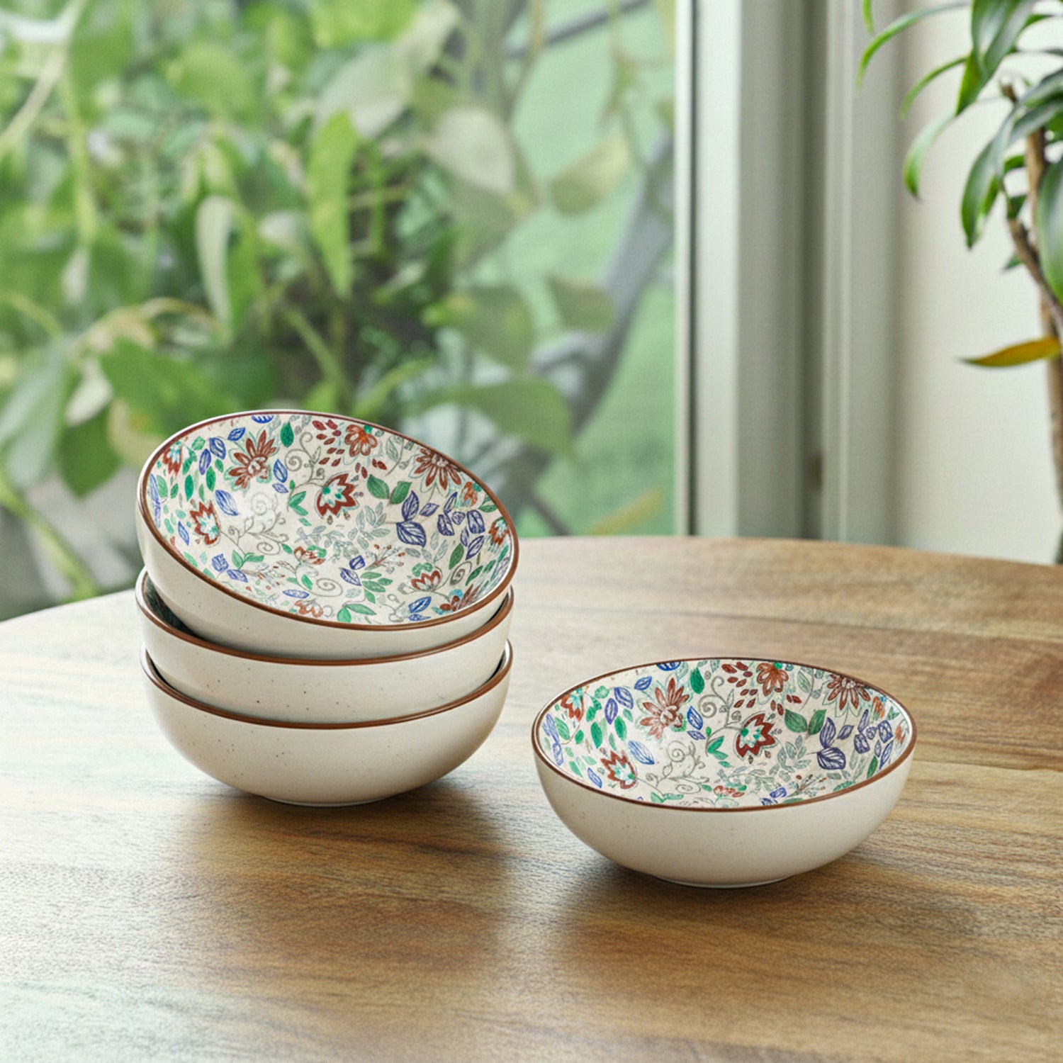 'Spring Garden' Ceramic Serving/Snack Bowls (Set of 4, 420 ML, Microwave Safe, Handcrafted)