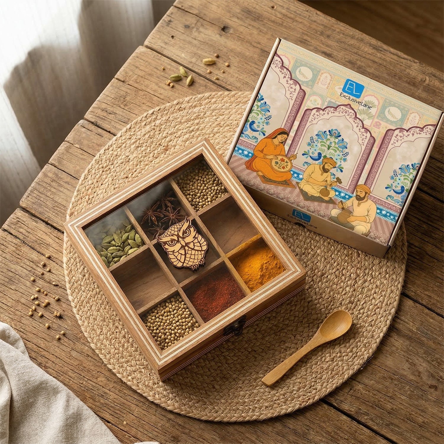 'Mystic Owl' Hand-Engraved Spice Box With Spoon In Teak Wood (9 Fixed Partitions, 110 ml)