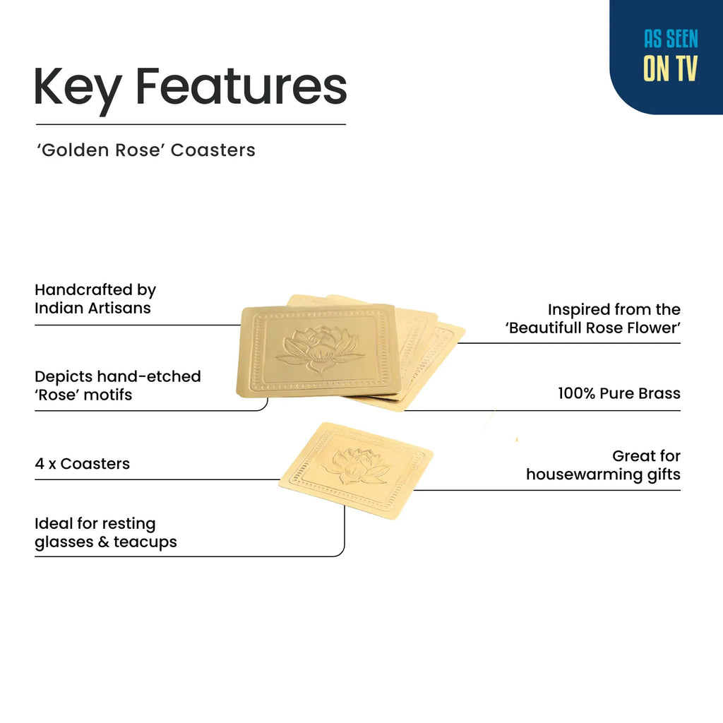 ExclusiveLane 'Golden Rose' Brass Coasters (Set Of 4, Hand-Etched)