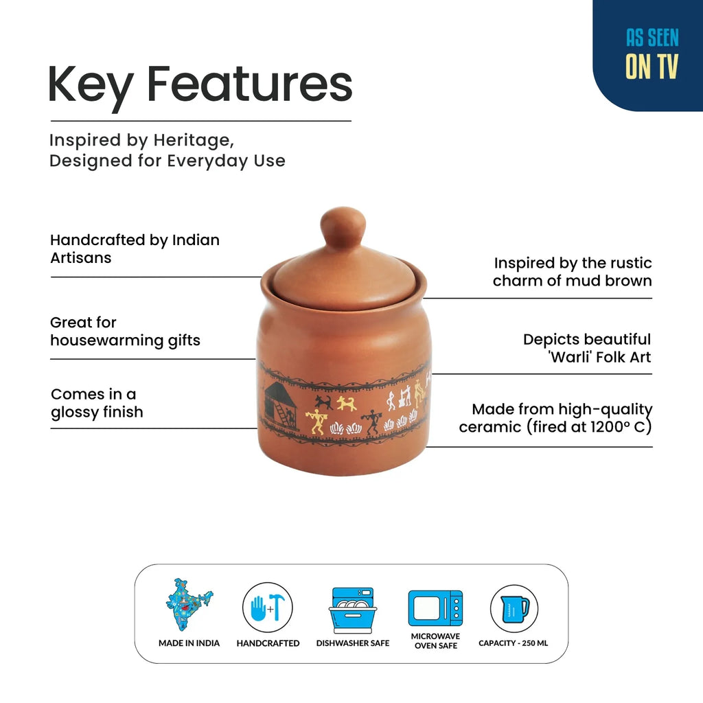 ExclusiveLane 'Warli Village Tales' Multi-Purpose Ceramic Pickle & Chutney Jar with Lid (Non Air-Tight, 250 ML, Handcrafted)