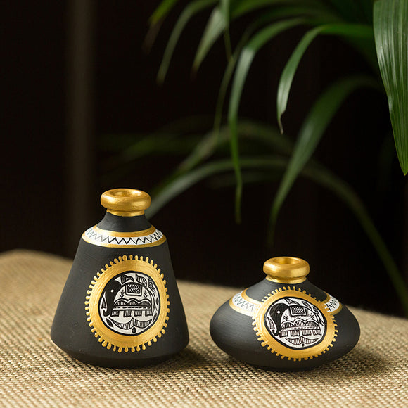 Skilfully handmade in terracotta and hand-painted with delicate details by tribal artisans from the interiors of India, €˜Tribal Pot-Faces€™ is a set of two beautiful pots that doubles up as an ethnic table top accessory. Inspired from indigenous tribal life and aesthetics, these pots have been hand embellished with rustic tribal features in the classic stone black colours. The minimalist facial features and jute detailing compliment the dholak shaped pot couple perfectly. The set includes a rounder shorter pot and an elongated pot, hand painted in beautiful contrasting reds and greens as details along with the classic addition of jute dori representing head gear. The compact design and simple utility with the beautiful stone black on earthen terracotta, brings the earthiness of native culture and a fragment of India€™s native legacy to all kinds of spaces. These tales of tribal ethnicity are handcrafted with love into this product exclusively for you and your loved ones.